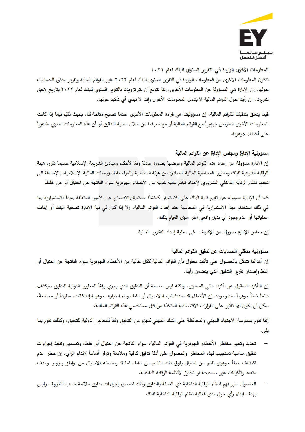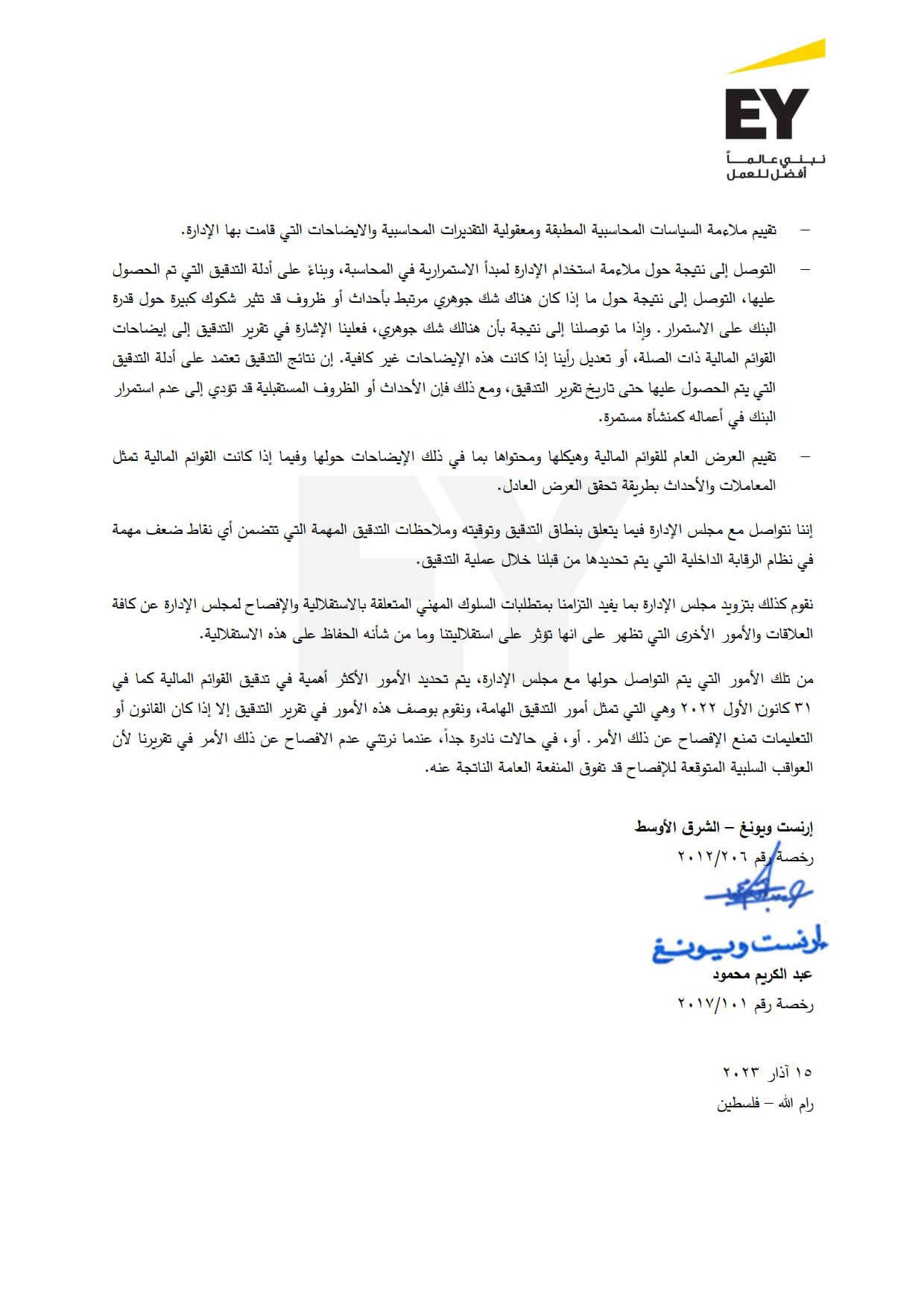 يقوم البنك واستنادا الي التعليمات والانظمة ذات العلاقة بالتعاقد مع شركة تدقيق حسابات خارجية وذلك بغرض تقديم تقرير حول عدالة البيانات المالية السنوية للسادة مساهمي المصرف استنادا إلى المعايير الدولية لممارسة اعمال التدقيق وقواعد وأصول وأخلاقيات المهنة.