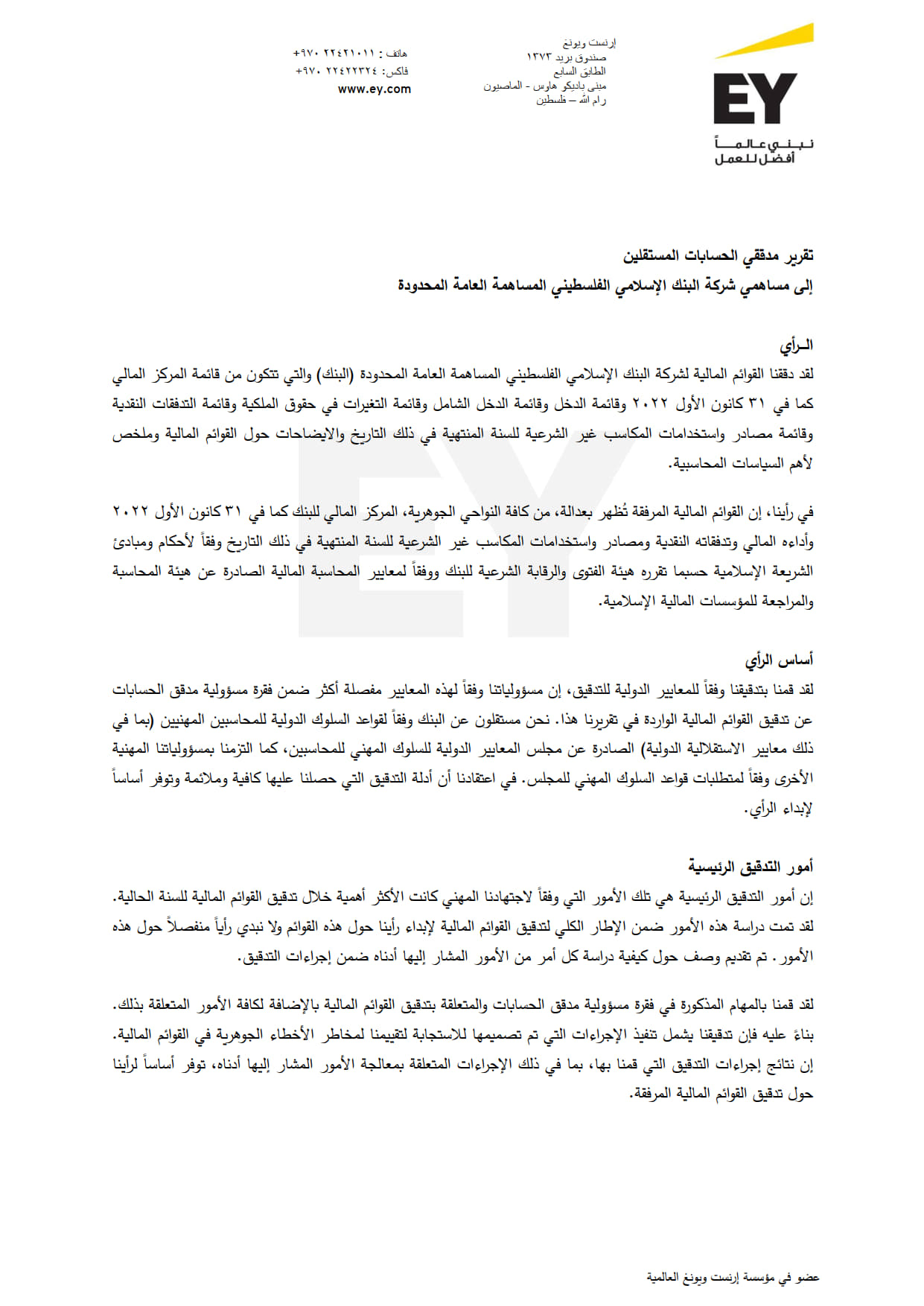 تابع البنك في العام 2022 تنفيذ برامجه التنموية على طريق التحول الرقمي للارتقاء بنوعية الخدمات المصرفية وإدراج منتجات إسلامية جديدة تتواءم مع تطورات الصيرفة الإسلامية العالمية واحتياجات السوق المحلي. وركّز البنك خلال العام على زيادة الاستثمار في التحول الرقمي وتطوير خدماته البنكية الالكترونية من خلال برامج متطورة واستخدام أحدث المعدات التكنولوجية كالصرافات الآلية المتطورة التي تؤدي خدمات عديدة ومتميزة لعملاء البنك. وأتت هذه الجهود ضمن الخطط المعدّة مسبقاً وتماشياً مع سياسات مجلس الإدارة الهادفة إلى الحفاظ على وتيرة نمو منطقية ومطردة من خلال رفع جودة الخدمة للعملاء وتحقيق مصالح المستثمرين وضمن الالتزام التام بأحكام الشريعة الاسلامية واتّباع أفضل المعايير في مجال إدارة المخاطر وزيادة الاستثمار. وانعكست هذه السياسة في تطور متواصل للخدمات والمنتجات التي يقدّمها البنك للجمهور، حيث جرى إطلاق العديد من المنتجات الجديدة ذات الصبغة الاسلامية وتم إطلاق بطاقات ائتمانية جديدة World Mastercard و Platinum Mastercard وهي الأولى من نوعها في فلسطين، علماً بأنه يتم الاعداد لإصدار بطاقات جديدة لتعزيز توجّه العملاء نحو الدفع الالكتروني.